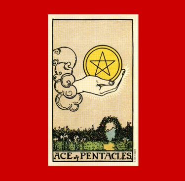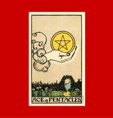 Nesse sentido o Ás de Ouros é a matéria pura e divina. Concentra em si todo o potencial de desenvolvimento material. É o símbolo da abundância e da prosperidade no seu sentido mais físico, também está relacionada ao conforto que os bens materiais podem gerar. É a promessa material de algo que ainda está sendo plantado.